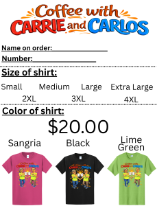 You can purchase your very own Coffee with Carrie & Carlos t-shirt and a percentage of the sales will help fund a food truck for the Shorb Market